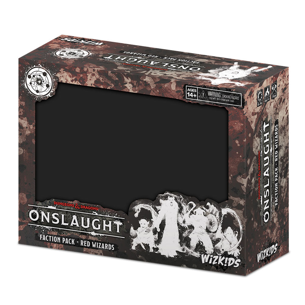 The Red Wizards Faction Pack expands your games of D&D Onslaught with a scheming and nefarious faction comprised of powerful spell casters and their martial allies. The Red Wizards have a number of characters capable of summoning minions like skeletons and shadowy hounds to their aid. Summoned creatures are represented by tokens, but could also be represented with miniatures bought separately from WizKids' D&D miniature lines.