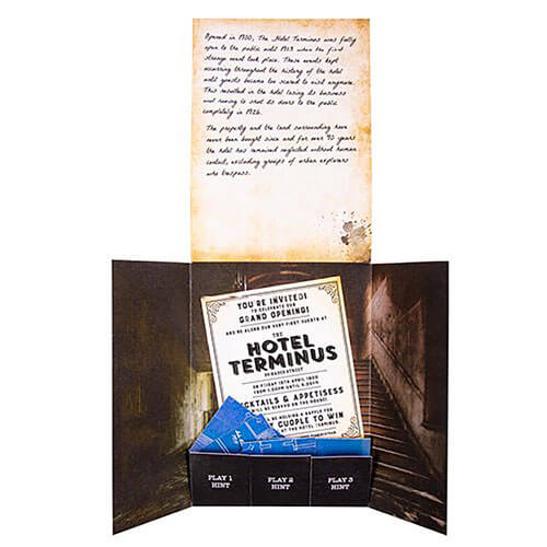 Players must move from room to room solving unique puzzles to work their way through the hotel before time is up and they are trapped forever.