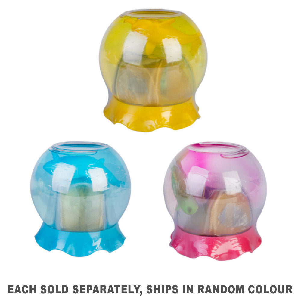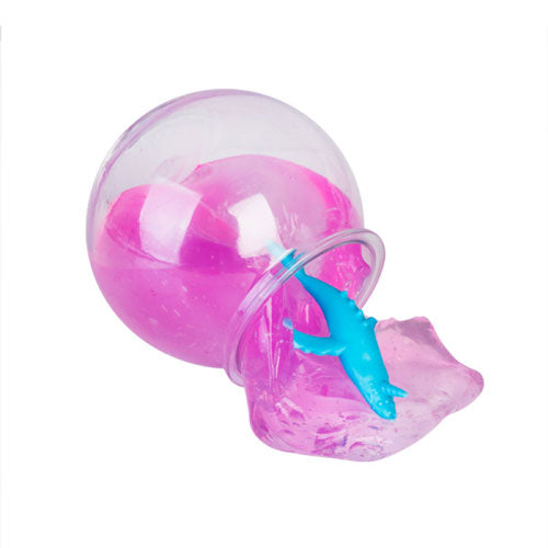 Ooey gooey slime with a sea creature swimming in each. Includes treasure chest with mystery surprise waiting to be dug out. Fishbowl-shaped jar with matching coloured lid keeps the slime dust-free. May vary from 3 bright colours.