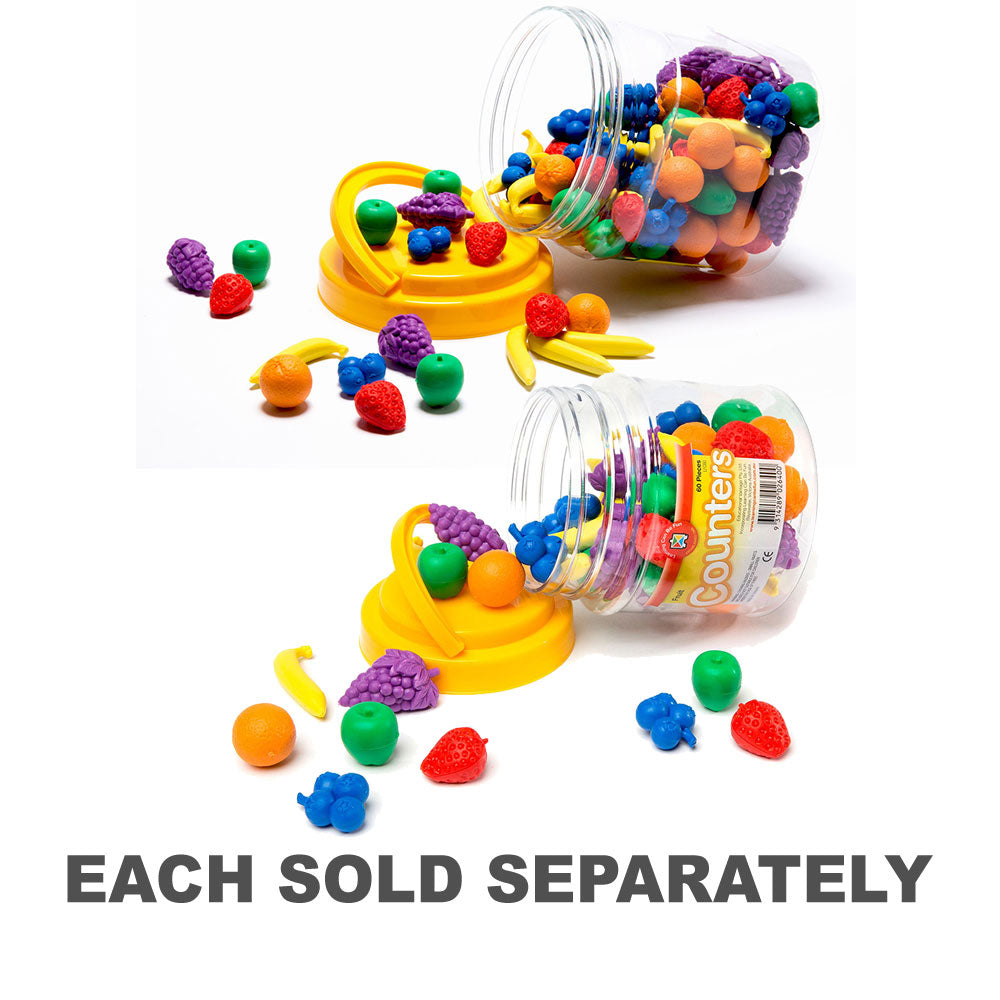 Count the fruit, name the fruit or sort the fruit. Keep little minds busy playing shops or just having fun. Comes in a sturdy PET jar of 108. 6 shapes and 6 colours.
