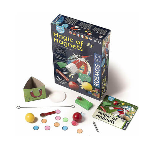 Thames and Kosmos Magic of Magnets science kit. Have fun and learn experimenting with invisible forces. Learn how to build a compass and where the magnetic poles are. With additional magnetic games.Eight different experiments covering topics to help our budding scientists to better under stand the concept of magnetism. Why are some metal objects attracted to magnets, but not all? How can iron become ' magnetised'; how do migratory birds use the Earth's magnetic field in their annual migrations. Learning is achieved through experimentation and applying principles learnt to some simple games.Magic of Magnets is in the same Fun Science series as Mysterious World of Crystals.