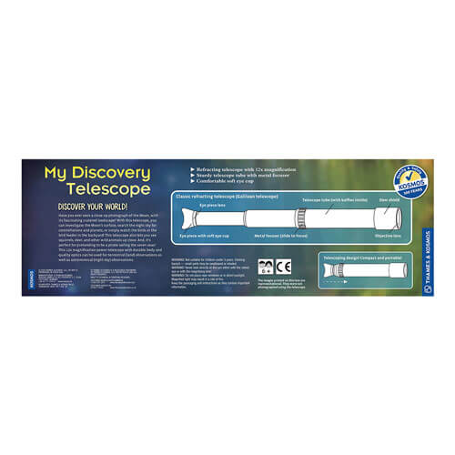 Have you ever seen a close-up photograph of the Moon, with its fascinating cratered landscape? With thistelescope, you can investigate the moon's surface, search the night sky for constellations and planets, or simply watch the birds at the bird feeder in the backyard!My Discovery Telescope also lets you see squirrels, deer, and other wild animals up close. And, it's perfect for pretending to be a pirate sailing the seven seas! This 12x magnification power telescope with durable body and quality optics can be used for terrestrial (land) observations as well as astronomical (night sky) observations.