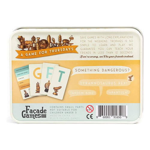 • DETAILS: Play this 5-15 minute long game with 2-30 players ages 8 years old and up. Trophies includes 70 unique trophy cards, 350 topics, and a teeny-tiny metal trophy for the winner.